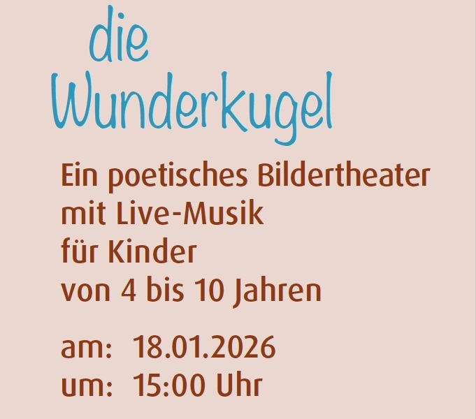 „Die Wunderkugel“ (von 4-10 Jahren) 29.3.2026 „Frederik“ (von 4-10 Jahren) 26.4.2026 „Matze, die kleine Miezekatze“ (von 3-6 Jahren) 10.5.2026 „Kleiner Eisbär, wohin fährst du?“ (von 3-6 Jahren) 2009.2026 „Wo Fuchs und Hase sich Gute Nacht sagen“ (von 3-6 Jahren)